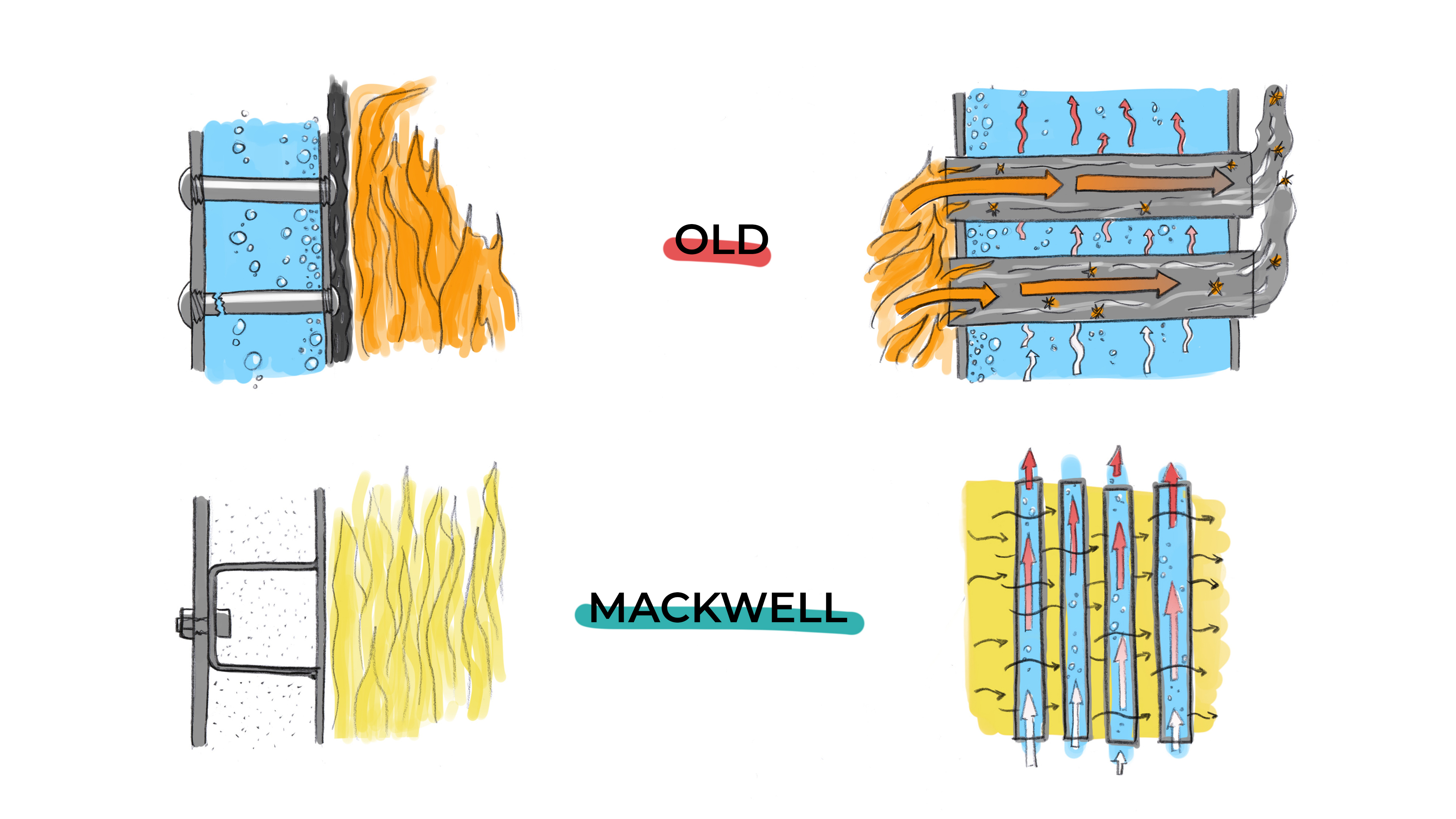 Our technology overcomes the challenges faced by conventional boilers, where a large volume of high pressure water surrounds a fire in a rectangular box with flat surfaces.